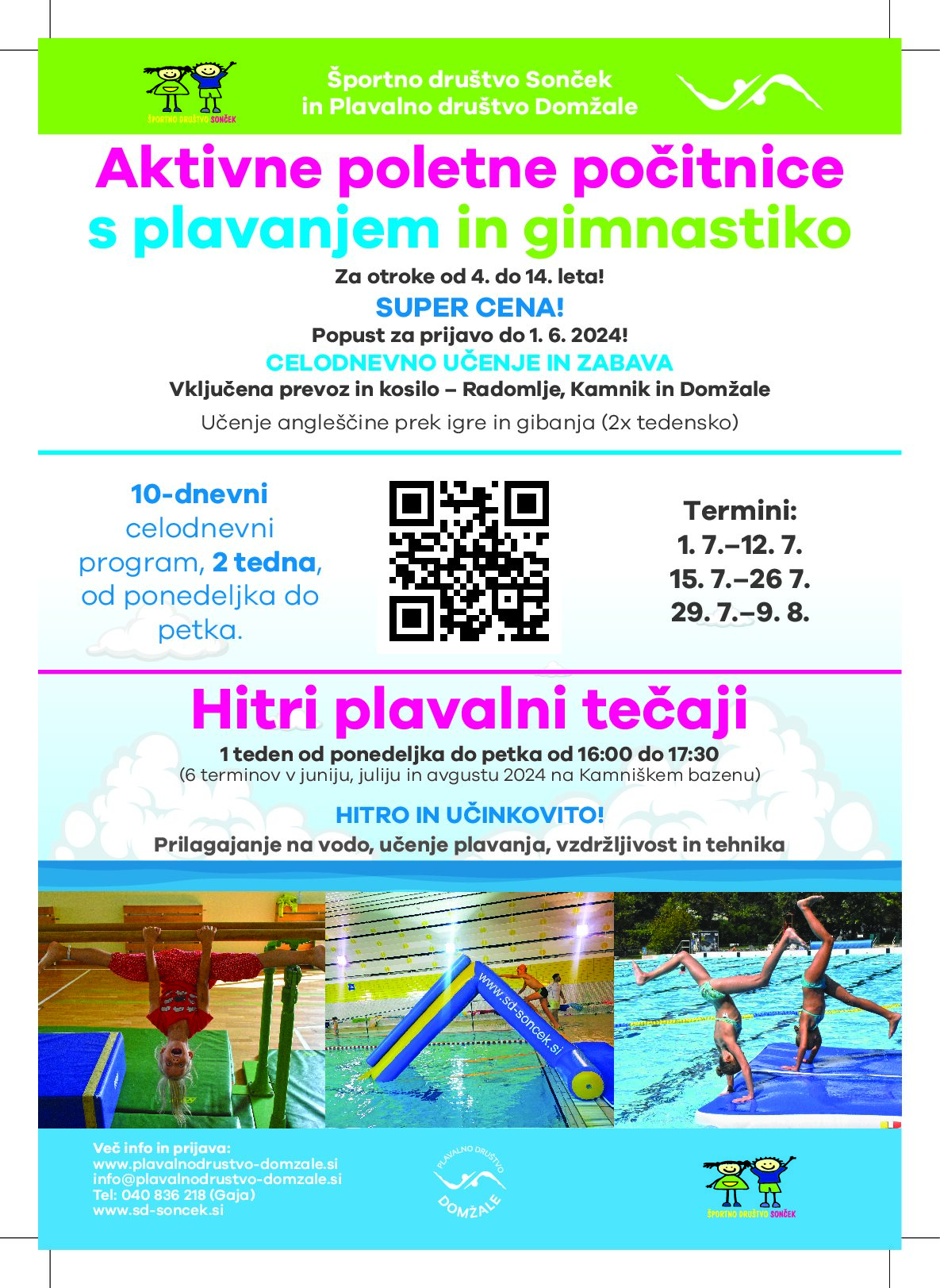 Tudi letos za vse Sončke in tiste, ki to še niso, pripravljamo nore poletne počitnice z gimnastično in plavalno šolo! Namenjene so predšolskim in šolskim otrokom ter najstnikom, ki si želijo počitnice preživeti aktivno.